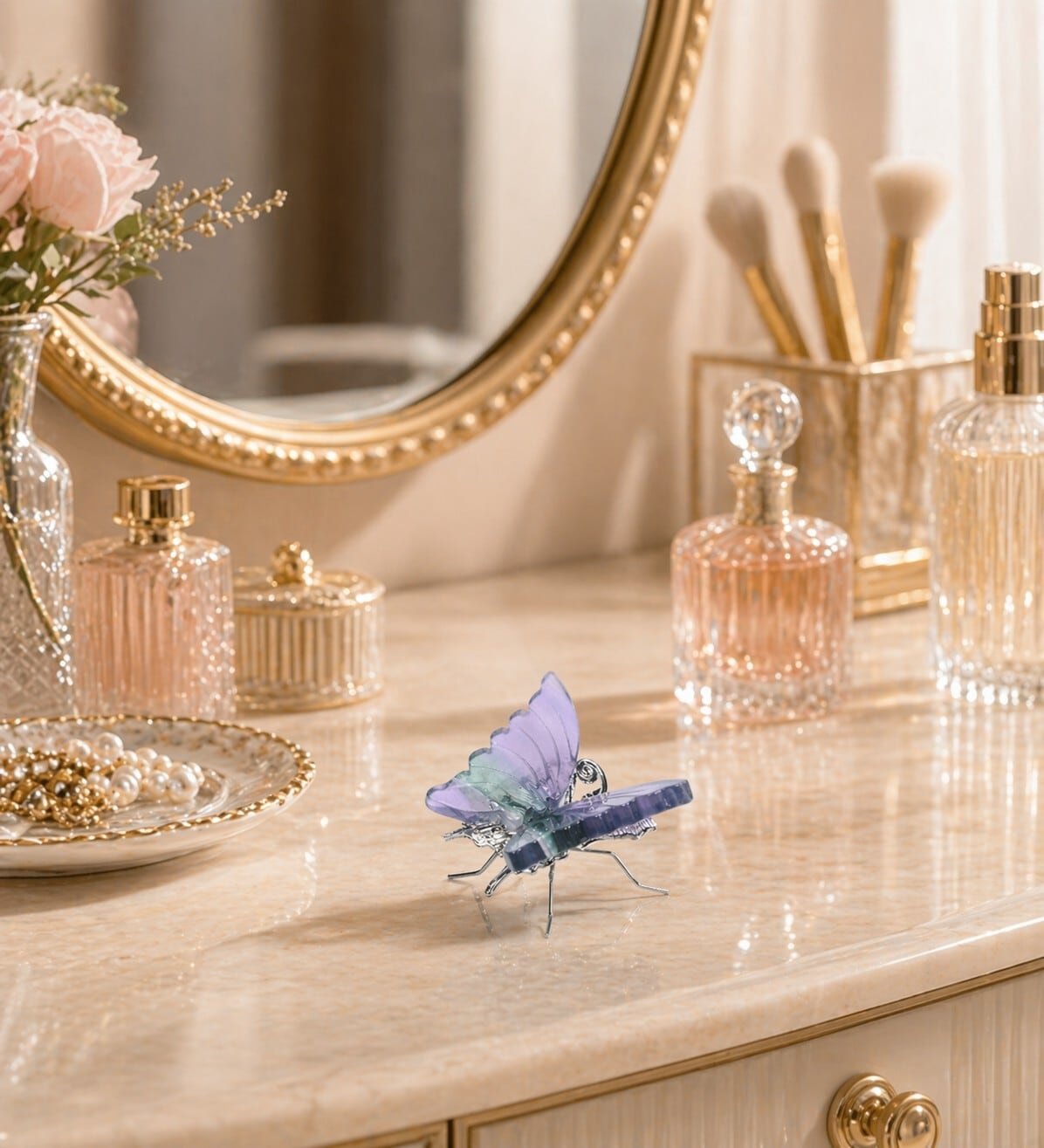 美しいフローライトを素材にした蝶々の彫刻は、まるで夢の中で舞う幻想の使者のような存在です。