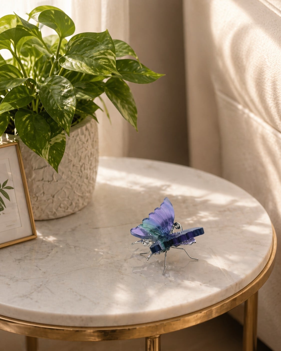 透明感のある石に宿る紫や緑のグラデーションが、羽ばたく蝶の繊細な羽根に命を吹き込み、光の角度によって表情を変えるその姿は、自然が生み出した奇跡と職人の技が融合した芸術品。